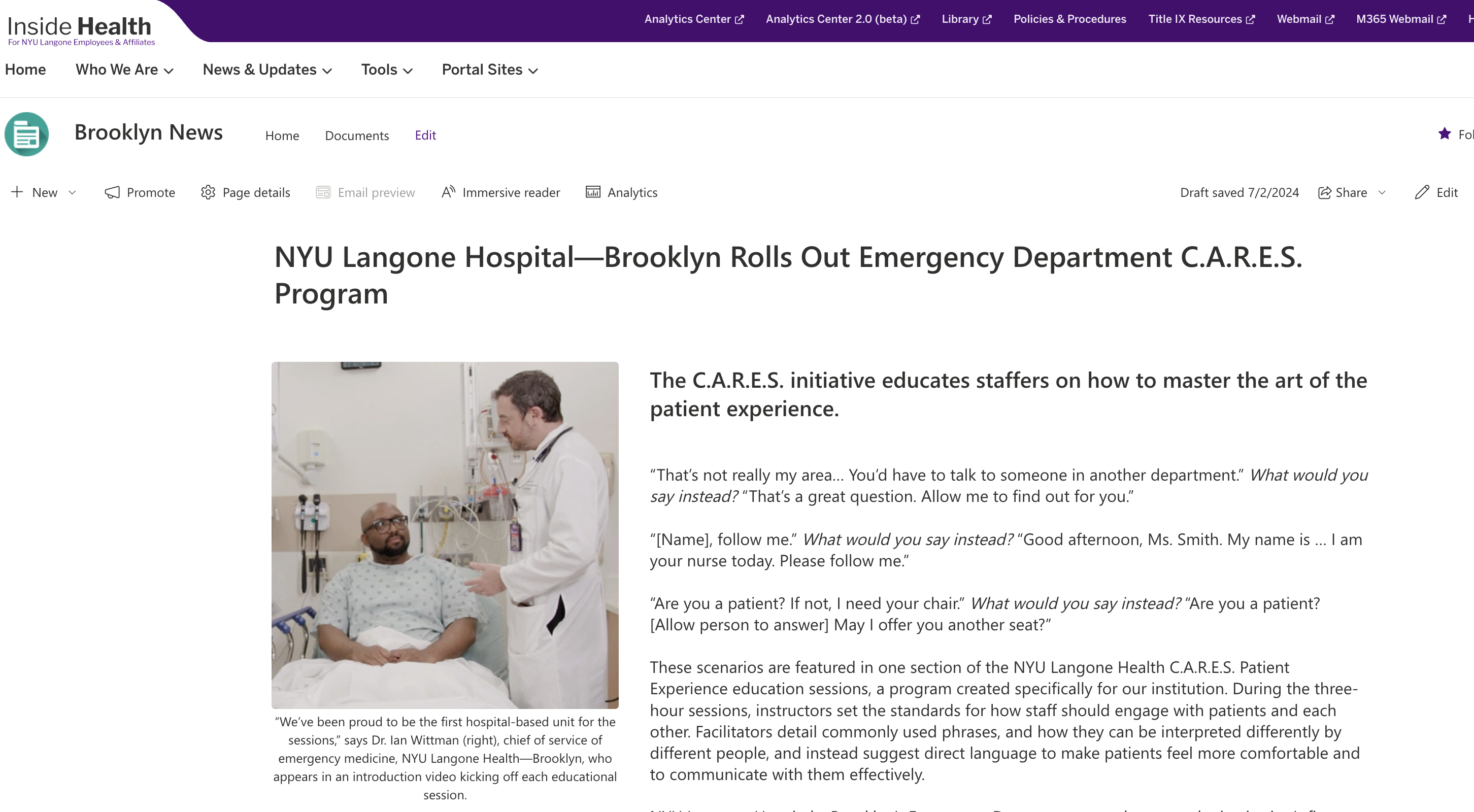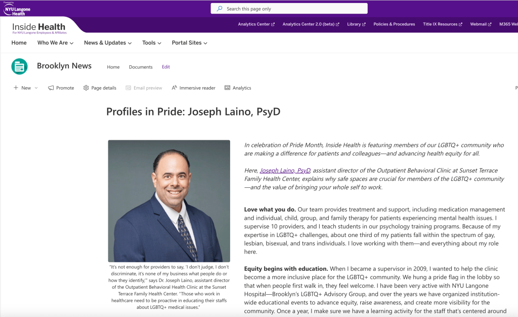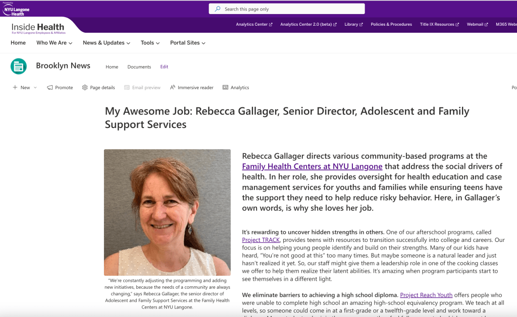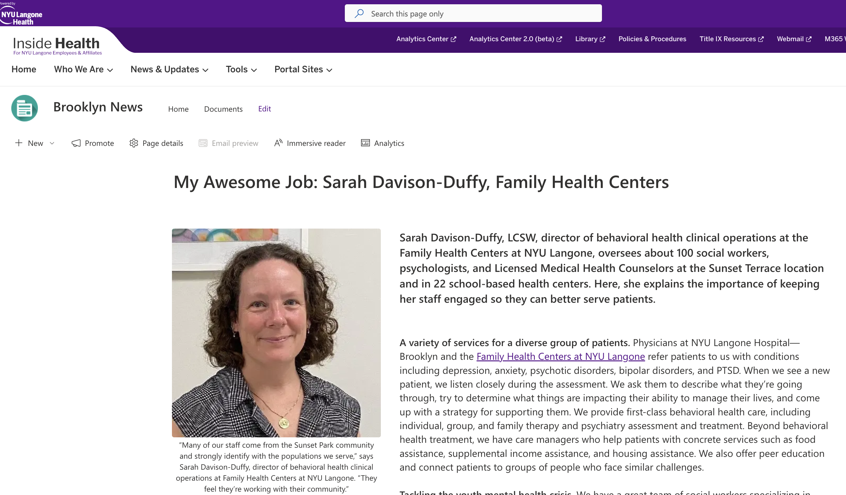 NYU Langone Health — Mental Health stories Click on the below examples to read the full offerings… Click to read profile of LCSW Sarah Davison-Duffy Read Pride profile of LGBTQ assistant director of Outpatient Behavioral Clinic Read profile of Rebecca Gallager, senior director of adolescent and family support services Click to read above story on telehealth stations bringing medical care of homeless shelters Click to read above feature on the Emergency Department’s C.A.R.E.S. program Share this: Click to share on X (Opens in new window) X Click to share on Facebook (Opens in new window) Facebook Like Loading...
